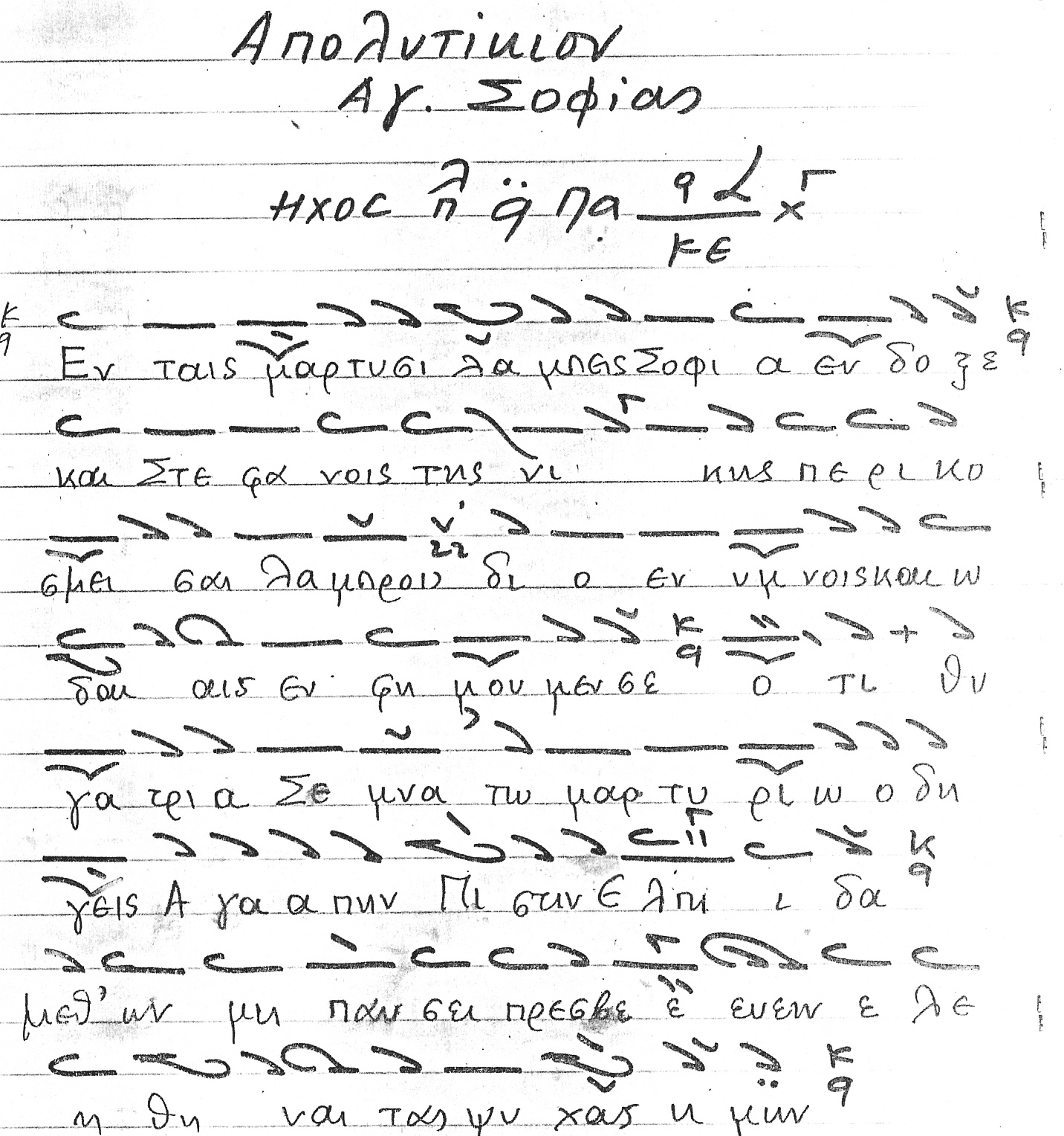 Χειρόγραφον (τοῦ 1987 περίπου) καὶ προσαρμογὴ μέλους ἀπὸ τὸν πρωτοψάλτην τοῦ ναοῦ ἁγίας Σοφίας Πατρῶν καὶ χοράρχην Χαράλαμπον Θεοτοκᾶτον.