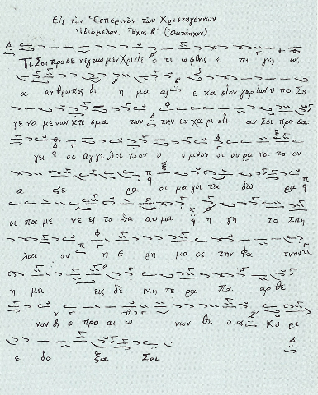 Τὸ γνωστὸν ἑσπέριον ἰδιόμελον τῶν Χριστουγέννων εἰς ἰδικήν του ὀκτώηχον μελοποίησιν.