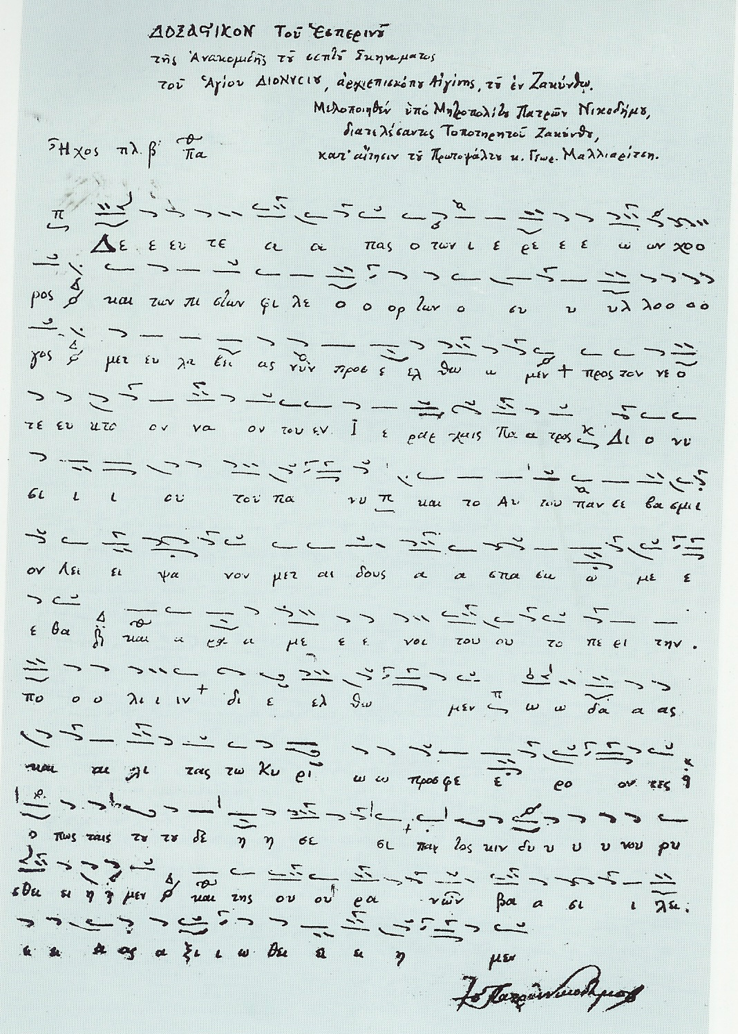 Δοξαστικὸν τοῦ ἑσπερινοῦ. ἐμελοποιήθη ὑπὸ τοῦ προσφάτως ἐκλιπόντος μουσικωτάτου ἱεράρχου Νικοδήμου (1915-2008, ἐκοιμήθη 16/11/2008, 93 ἐτῶν), ὅτε διετέλεσε τοποτηρητὴς τῆς μητροπόλεως Ζακύνθου (1974-1976). ἐμελοποιήθη δὲ κατ᾿ αἴτησιν τοῦ πρωτοψάλτου Γεωργίου Μαλλιαρίτση.