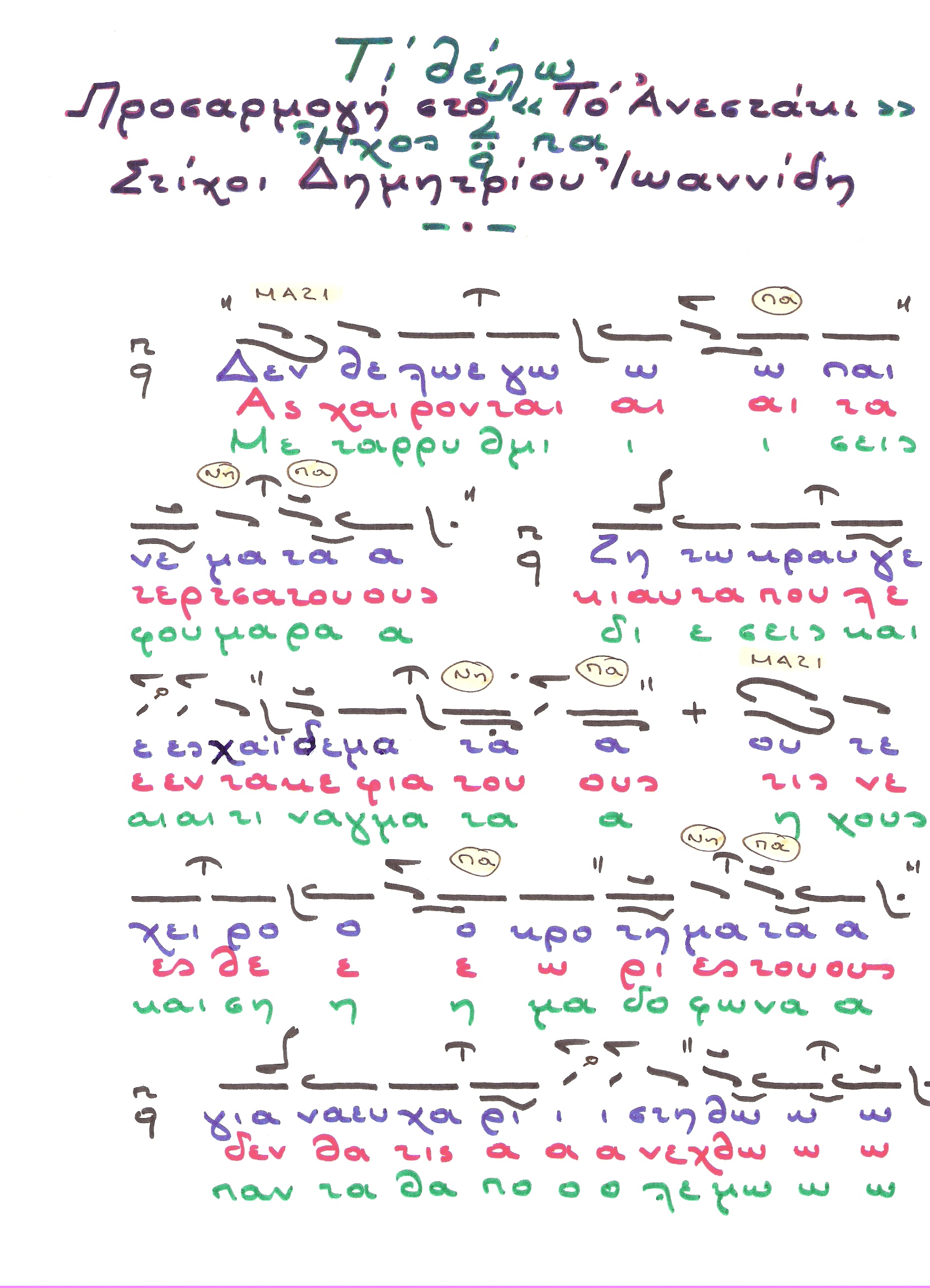 Το τραγούδι αυτό, δημοσιεύτηκε από τον Βασίλη τον Κατσιφή, στο βιβλίο του "Ψαλτοτράγουδα", σε εντελώς διαφορετική μορφή. Δηλαδή σε άλλο Ρυθμό και σε μερικά σημεία, διαφορετικό Μέλος ( ιδίως στο τέλος ). Εδώ παρουσιάζεται σε διασκευή.