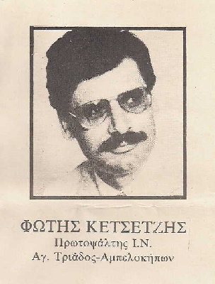 ῾Ο Φώτιος Κετσετζῆς συμψάλλει μὲ ἄλλους δύο πρωτοψάλτες σὲ ἐκπομπὴ τῆς ᾿Αριέτας Παλιατσάρα, ποὺ μεταδόθηκε τὴν κυριακὴ πρωὶ 2/4/1989.