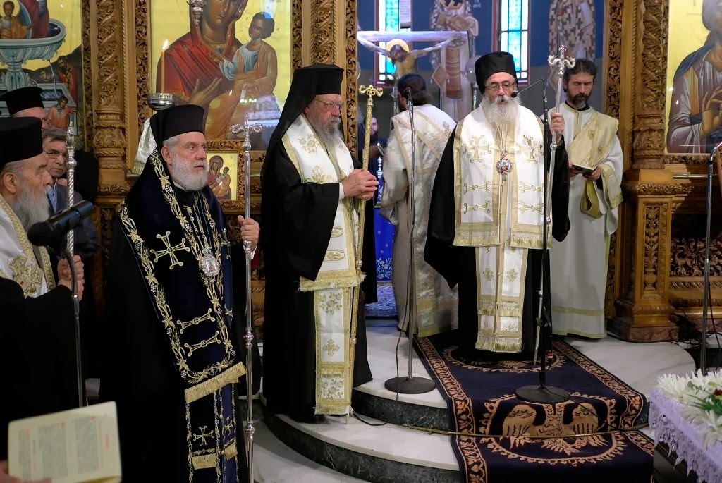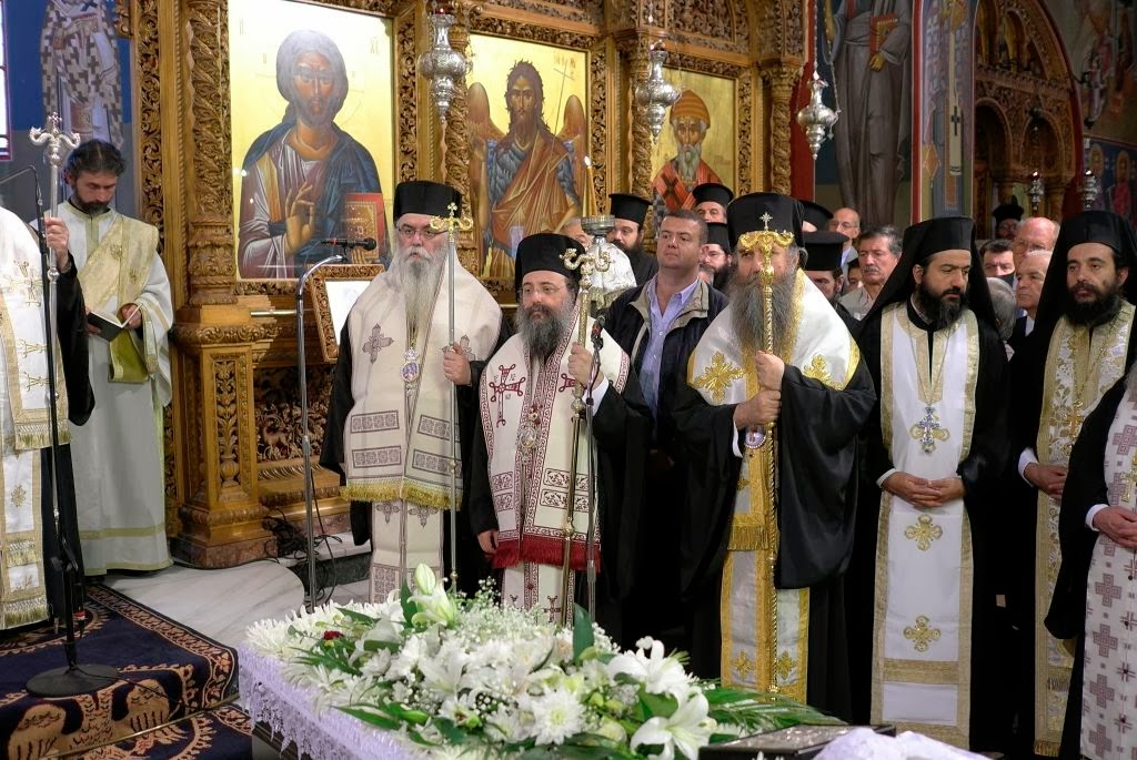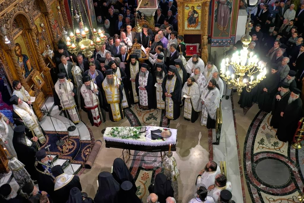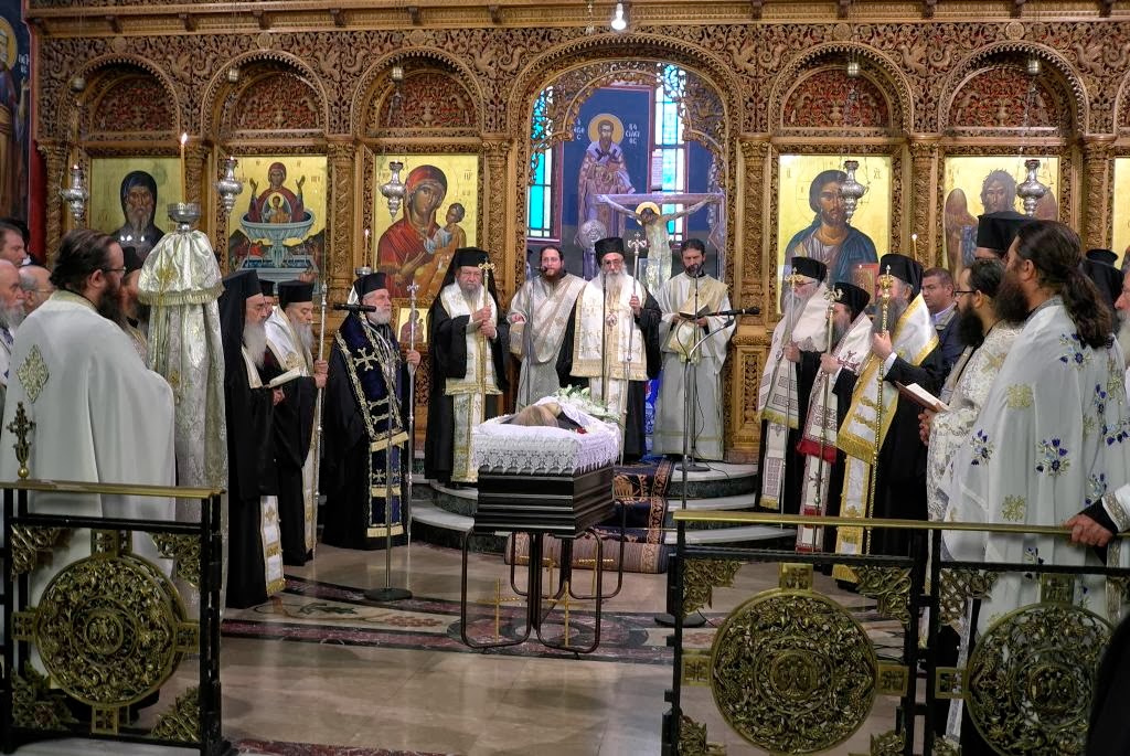 Στὴν ἐξόδιο ἀκολουθία προεξῆρχε ὁ σεβασμιώτατος Ἀρχιεπίσκοπος Σινά, Φαρὰν καὶ Ραϊθὼ κ. Δαμιανὸς καὶ συμμετεῖχαν οἱ σεβασμιώτατοι Μητροπολῖτες Καρπενησίου κ. Νικόλαος, Καστορίας κ. Σεραφείμ, Σύρου Τήνου Ἄνδρου Κέας καὶ Μήλου κ. Δωρόθεος, Πατρῶν κ. Χρυσόστομος, Γόρτυνος καὶ Μεγαλοπόλεως κ. ᾿Ιερεμίας, καὶ Τριφυλίας καὶ Ὀλυμπίας κ. Χρυσόστομος, ἐνῷ στὸ ἱερὸ βῆμα παρέστη ὁ Μητροπολίτης Εὐρίπου κ. Βασίλειος. Ἀργότερα προσῆλθε, γιὰ νὰ ἐκφράσει τὶς εὐχές του στὸν ποιμενάρχη μας καὶ ὁ Μητροπολίτης Λευκάδος καὶ Ἰθάκης κ. Θεόφιλος.