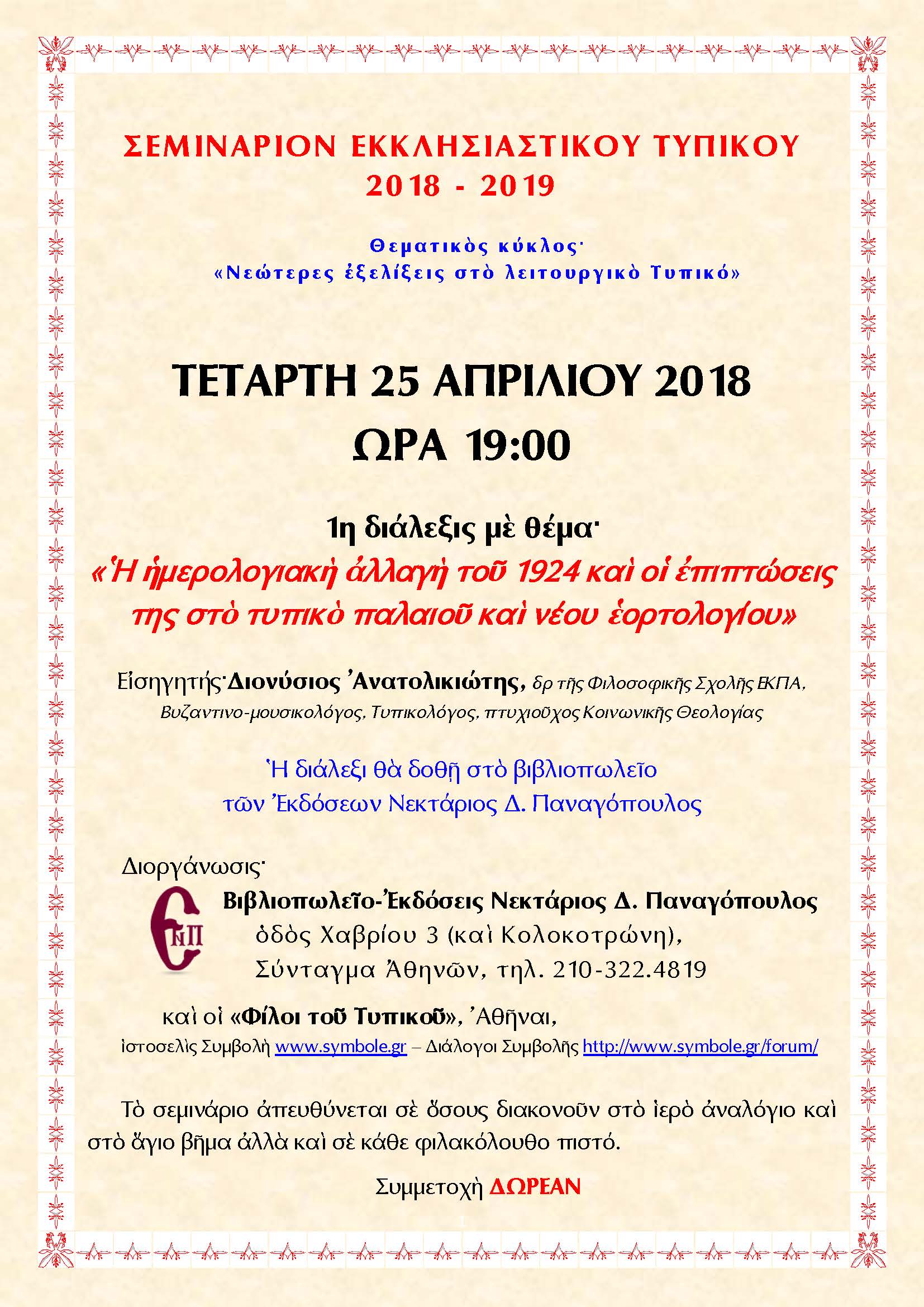 Re: Σεμινάριον ᾿Εκκλησιαστικοῦ Τυπικοῦ στήν ᾿Αθήνα 2018-2019