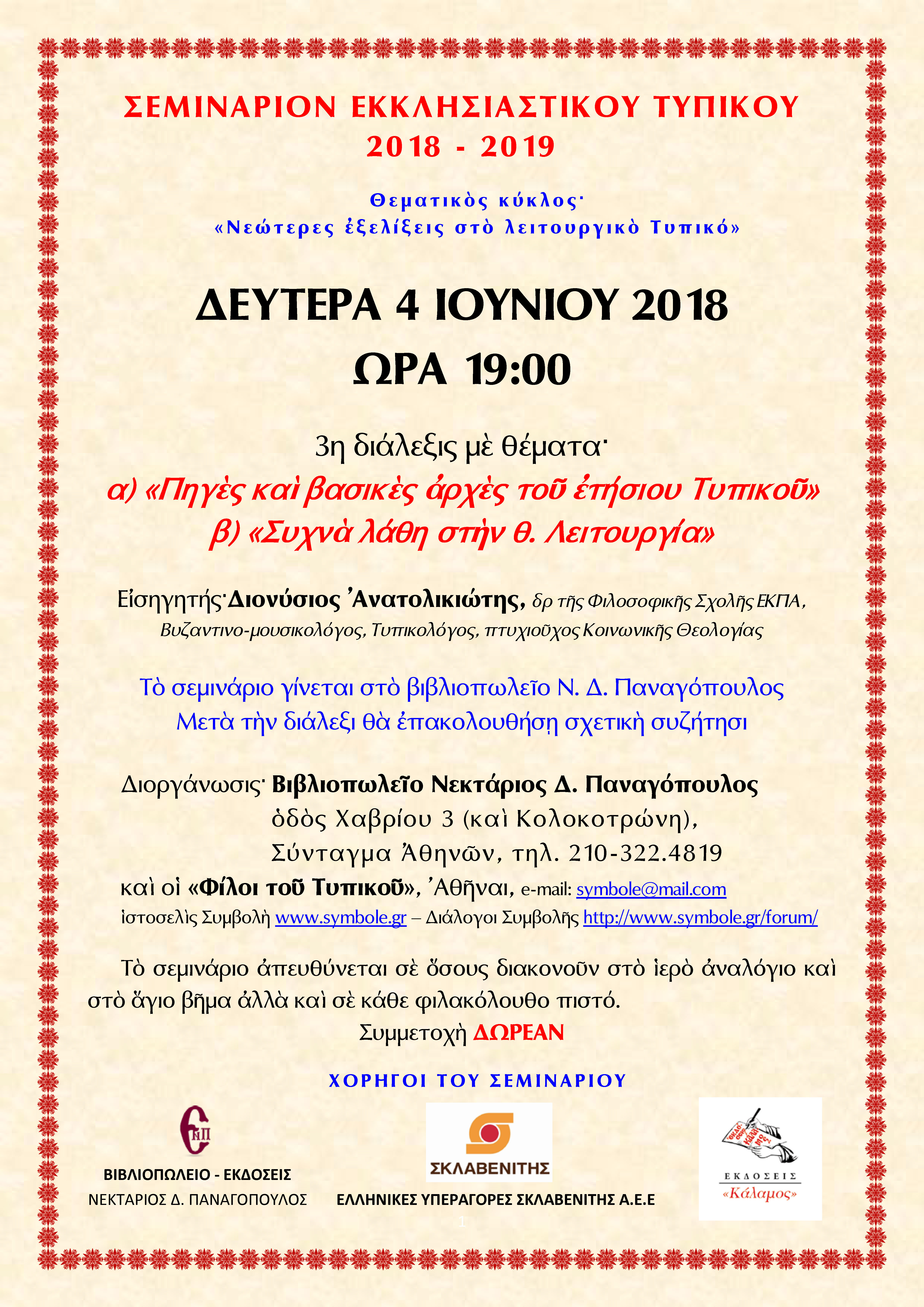 ᾿Απὸ τὴν προηγούμενη ἐνημέρωσι γνωρίζετε ἤδη ὅτι τὴν Δευτέρα 4 ᾿Ιουνίου 2018 θὰ πραγματοποιηθῇ ἡ 3η διάλεξι τοῦ σεμιναρίου στὸ βιβλιοπωλεῖο τῶν ᾿Εκδόσεων Ν. Παναγόπουλος (διεύθυνσι· Χαβρίου 3 καὶ Κολοκοτρώνη, Σύνταγμα ᾿Αθηνῶν, τηλ. 210-322.4819), καὶ ὥρα 19.00 (7 μ.μ.).