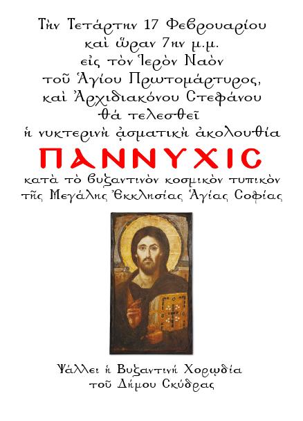 Η Ασματική Ακολουθία "Παννυχίς" θα τελεσθεί την Τετάρτη της πρώτης εβδομάδας των Νηστειών [17 Φεβρουαρίου και ώρα 7:00 μ.μ.]