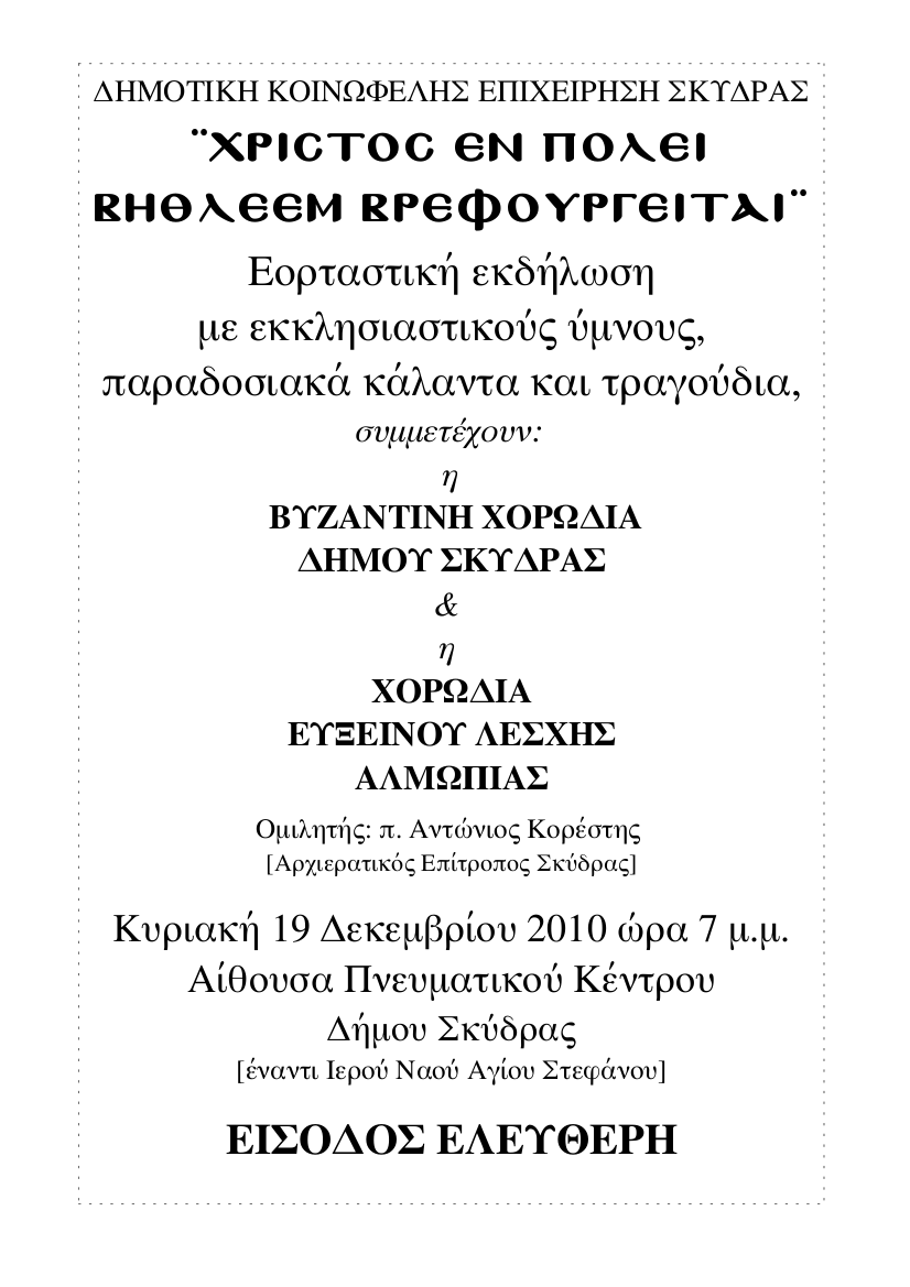 Χτὲς ἦταν ἡ χριστουγεννιάτικη ἐκδήλωσις τῆς βυζαντινῆς χορῳδίας τοῦ Δήμου Σκύδρας μὲ χοράρχη τὸν ἀγαπητὸ Δημήτριο Καλπακίδη. θεωρῶ δεδομένη τὴν ἐπιτυχία καὶ εὐελπιστῶ ὅτι θὰ ἔχουμε τὴν χαρὰ νὰ ἀκούσουμε κάποιες ἠχογραφήσεις καὶ ἐμεῖς ποὺ δὲν μπορέσαμε νὰ παρευρεθοῦμε λόγῳ ἀποστάσεως.