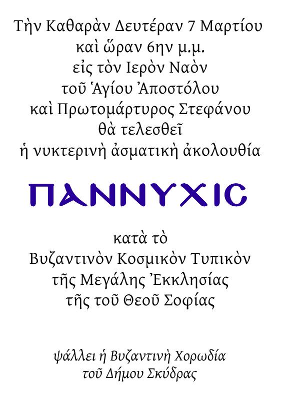 dkalpakidis έγραψε:Η Ασματική Ακολουθία "Παννυχίς" θα τελεσθεί την Δευτέρα της πρώτης εβδομάδας των Νηστειών [7 Μαρτίου και ώρα 6:00 μ.μ.]